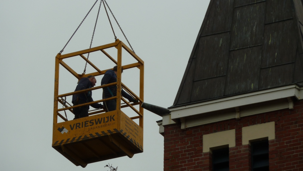 Met behulp van een torenkraan van de firma Vrieswijk uit Surhuisterveen zijn de dakpannen vandaag door Bouwbedrijf Paauw uit Munnekezijl weer vakkundig op zijn plaats teruggelegd.