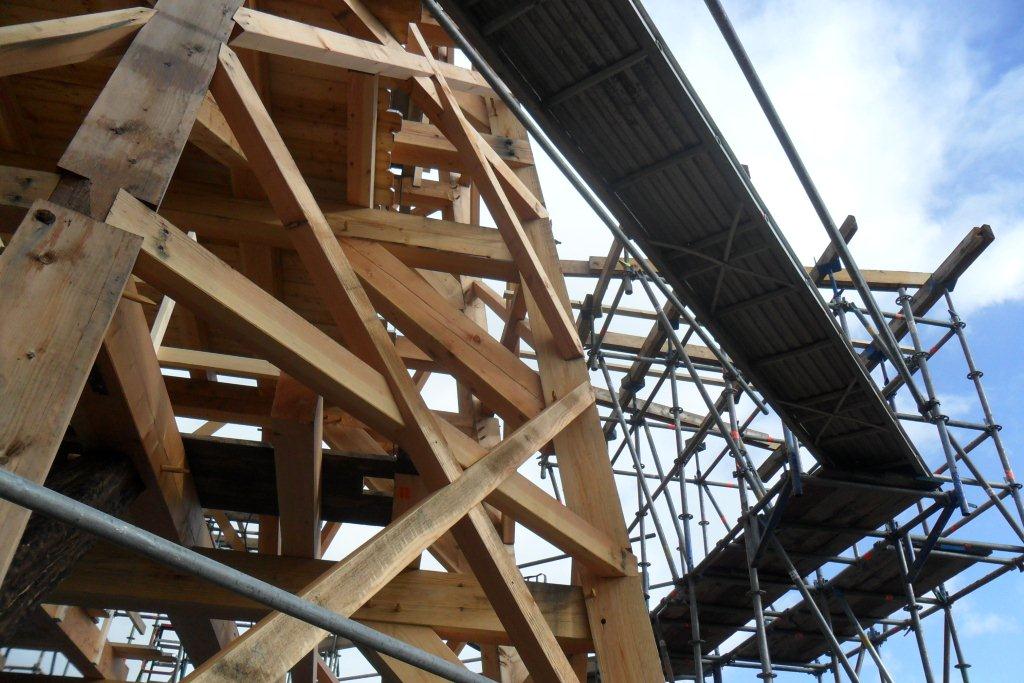 De steigers staan er klaar voor! Morgen, woensdag 30 oktober, zal met behulp van een telescoopkraan de stelling over het achtkant heen getild worden, en geplaatst op molen Windlust.