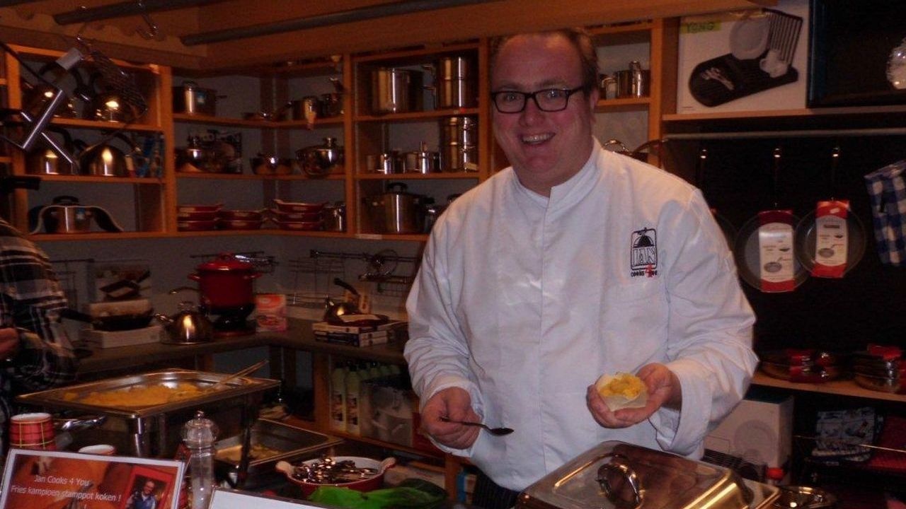 Vrijdagavond was Fries Kampioen Stamppot koken Jan Cooks4 You in de zaak van Rosier aan de Grote Breedstraat in Dokkum aanwezig om het winkelend publiek te laten proeven van de winnende pompoenstamppot en ook kon er pompoensoep worden geproefd.