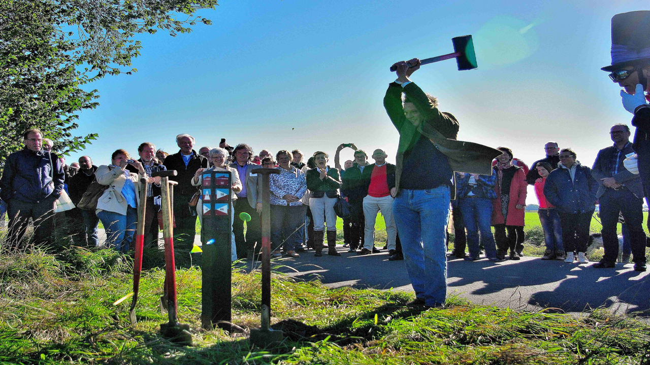 3. Gedeputeerde Piet de Vey Mestdag van de provincie Groningen sloeg de laatste knooppuntpaal van het routenetwerk Waddenwandelene.