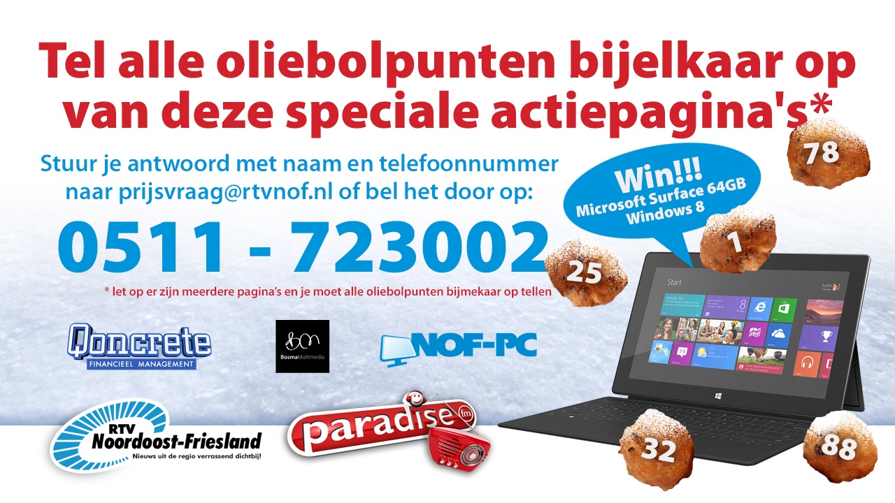 Tel de punten op de speciale oliebollensheets (hiernaast) bij elkaar op. Stuur je antwoord naar prijsvraag@rtvnof.nl of bel de prijzenlijn op 0511-723002. Op nieuwjaarsdag wordt de winnaar van deze actie bekend gemaakt. Kijk ook op www.paradisefm.nl  voor meer actie’s zoals het winnen van een diner voor twee in café/restaurant Lauwersland.